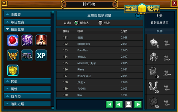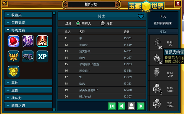 人生,也许就是一个挑战接着一个挑战,一个比赛接着一个比赛。也许,对你来说,早已对一层不变的挑战丧失了斗志和兴趣,但《宝藏世界》中的挑战和排行榜也许会改变你的看法。在《宝藏世界》中,竞赛栏目是每周随机刷新的哦,每周的竞赛项目都不同,想要赢得挑战,名列前茅,你所面对的挑战也完全不同。每周五晚上七点后至下周五晚上七点为一个周期,在此期间,所有玩家都可以针对本周竞赛项目展开角逐。同时,每周竞赛项目都不同,也许这周是经验排行,墓灵战力,下周就是摧毁方块总数、糖果野蛮人战力PK等等。总之,在《宝藏世界》中,每一周都会有全新的挑战等你前往,也有不同的宝藏等你发现哦!