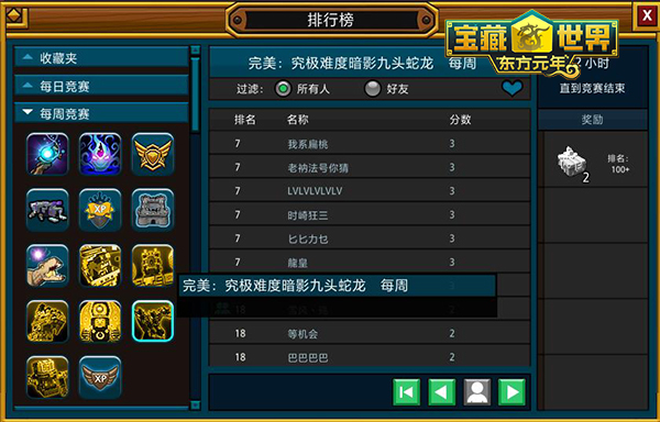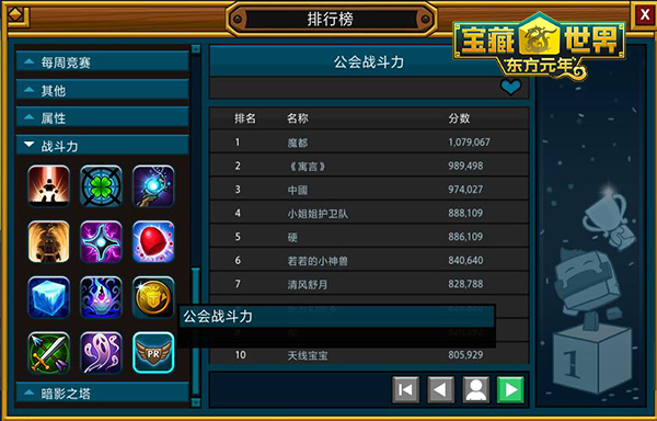 比个人荣誉更重要的是集体的荣耀。和志同道合的人一起玩游戏,迎接挑战,《宝藏世界》每周随机刷新挑战内容,各种各样令人眼花缭乱的排行榜更是虚位以待!每周的竞赛项目不同,你所面对的挑战也随之改变,所有玩家都可以针对本周竞赛项目展开角逐。随着新版“东方元年”的上线,全新排行榜也已上线,这次不仅有个人之间战力的角逐,挑战的达成,更考验集体的合作精神,排行榜新增公会相关挑战,全服公会战力排行名列前茅的公会,会长将会获得蓝名奖励哦!值得注意的是,公会战力排行以公会战力前50的成员的战力值为准,这不是一个人的荣誉,而是整个公会实力的象征,加油吧!同时,公会经验排行榜也全新出炉,通过完成英雄NPC发布的任务为公会建设增砖添瓦,贡献值越高,你就越有几率出现在排行榜上,名列前茅者还有黄金混沌宝箱奖励哦!
