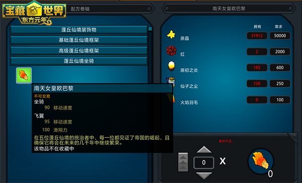 想要拥有这么一只拉风的费风坐骑,不要998,只需要凑齐材料即可进行制作哦!在《宝藏世界》中,你可以通过工作台制作坐骑、飞龙、服饰、宠物、道具等等,自由的世界万物可造!全新坐骑飞凤也可以通过制造出来哦!所有玩家都可以在创造者的工作台制作全新工作台——蓬丘仙境工作台解锁全新世界的配方。作为新版中最为瞩目的中国风坐骑,新坐骑南天女皇欧巴黎可以通过收集材料制作而成哦!其中用到的火焰羽毛为蓬丘仙境地下城掉落,红矿石也可以在蓬丘仙境地形中找到哦!
